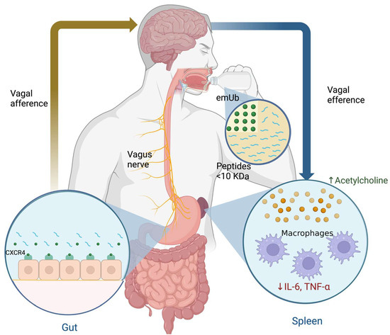 The mechanism of action (MOA) of emUb is not fully understood, but experimental data suggest that Ub blocks partially the CXCR4/CXCL12 axis [126,138,139,140]. CXCR4 is related to the production of TNF-α in macrophages by the MAPK and NF-κB signaling pathways [141]. It has been described that Ub is a CXCR4 partial agonist which is expressed on various tissues such as nerves and leucocytes [139]. In this sense, it was suggested that emUb may interacts with the CXCR4 expressed in the afferent endings of the vagus nerve in the stomach after oral administration and, subsequently, causes a slight activation of the CAP (as mentioned above). The CAP induces the inhibition of TNF-α release by spleen macrophages through ACh signaling pathways and decreases serum cortisol concentrations (Figure 8) [118,142,143]. In addition, emUb has been shown to induce immunomodulatory effects in macrophages and lymphocytes, such as decreased chemotaxis, proliferation, and cytokine secretion through CXCR4 receptor-mediated regulation of the inflammatory response triggered by damage-associated molecular patterns (DAMPs) and pathogen-associated molecular patterns (PAMPs), in order to avoid a hyper-inflammatory response [131,144]. A third possible immunomodulatory mechanism may involves professional antigen-presenting cells like dendritic cells (DCs). The maturation of DCs is crucial for stimulating T-cell responses to foreign antigens and for maintaining immune tolerance to self antigens [145]. DC maturation requires the up-regulation of MHC class II (MHC-II) on the surface, as well as co-stimulatory molecules, such as CD80 and CD86 [145,146]. An important mechanism controlling surface expression of MHCII and CD86 is the ubiquitin-dependent degradation of these molecules [146,147]. Ubiquitination of MHC-II and CD86 is carried out by Membrane-Associated RING-CH-1 (MARCH1), which is an E3 ubiquitin ligase and promotes endocytosis and lysosomal degradation of MHC-II and CD86 [145,146,147]. Under basal conditions, MARCH1 is downregulated during DC maturation and IL-10 induces its expression. Thus, emUb administration reduces the surface expression of MHCII and CD86 on DCs and THP-1 macrophages [145,146,148]. Finally, it has been observed that ubiqutinization of MHC-II and CD86 promotes the differentiation of regulatory T cells [146].