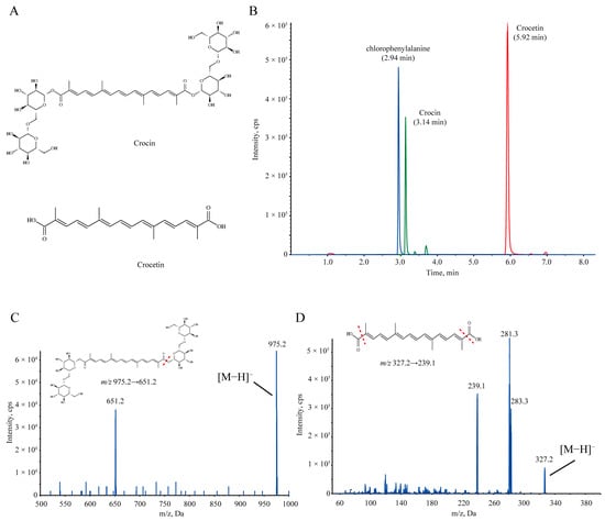 (A) Chemical structures of crocin (top) and crocetin (bottom). (B) HPLC-MS/MS chromatograms of crocin, crocetin, and chlorophenylalanine (internal standard). (C) The mass spectra and product ions of crocin. (D) The mass spectra and product ions of crocetin.