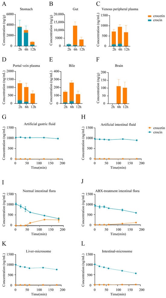 Studies on the metabolic positions of crocin in rats. Crocin and crocetin concentrations in stomach tissues (A), intestinal tissues (B), peripheral plasma (C), hepatic portal plasma (D), bile (E), and brain (F) after a single administration of crocin (100 mg/kg) over time. Error bars represent mean ± SEM (n = 4). The metabolism of crocin and crocetin in artificial gastric fluids (G), artificial intestinal fluids (H), fecal suspensions of C group rats (I), fecal suspensions of ABX group rats (J), liver microsomal culture medium (K), and intestinal microsomal culture medium (L). Error bars represent mean ± SEM (n = 3).