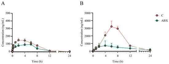 Effect of intestinal flora on the PK of crocin and crocetin after crocin oral administration. Mean serum concentration–time curve of crocin (A) and crocetin (B) following the administration of a single oral dose of crocin (100 mg/kg) to C and ABX rats. Each value represents the mean ± SEM of 12 animals.