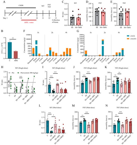 Effect of the intestinal microbiota on crocin metabolism and efficacy. (A) The schedule of ABX treatment, CSDS paradigm, and behavioral testing. (B) Number of intestinal bacteria. Data are shown as mean ± SEM (n = 3), ** p < 0.01. (C–E) Effects of antibiotic treatment on SIT, FST, and TST in SS mice. The number of experimental subjects is indicated by the dots in the figures. Data are shown as mean ± SEM (n = 7–9). Distribution of crocin and crocetin in various intestinal segments of C group (F) and ABX group (G) mice. Data are shown as mean ± SEM (n = 4). (H) Individual SI ratio values before and after the administration of a single oral dose of crocin, *** p < 0.001. The SI ratio value in the SIT (I) and the immobility times in the FST (J) and TST (K) after the administration of a single oral dose of crocin. The number of experimental subjects is indicated by the dots in the figures. Data are shown as mean ± SEM (n = 7–9), ** p < 0.01, *** p < 0.001 vs. SS group. The SI ratio value in the SIT (L) and the immobility times in the FST (M) and TST (N) after multiple doses of crocin. The number of experimental subjects is indicated by the dots in the figures. Data are shown as mean ± SEM (n = 6–9), * p < 0.05, ** p < 0.01, *** p < 0.001 vs. SS group.