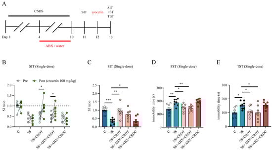 The rapid antidepressant effect of crocetin and the effect of the intestinal flora. (A) The experimental design of the CSDS paradigm, ABX treatment and administration of crocetin. (B) Individual SI ratio values before and after the oral administration of a single dose of crocetin, * p < 0.05. The SI ratio value in the SIT (C) and the immobility times in the FST (D) and TST (E) after the oral administration of a single dose of crocetin. The number of experimental subjects is indicated by the dots in the figures. Data are shown as mean ± SEM (n = 7–9), * p < 0.05, ** p < 0.01, *** p < 0.005 vs. SS group. CROT, crocetin.