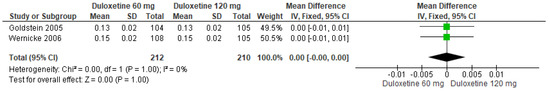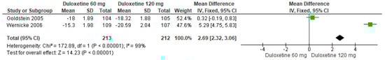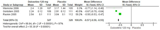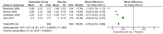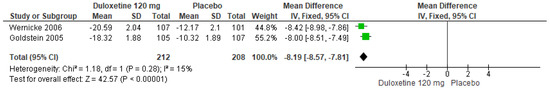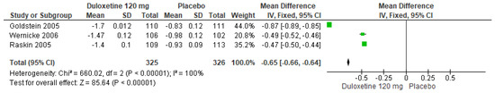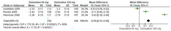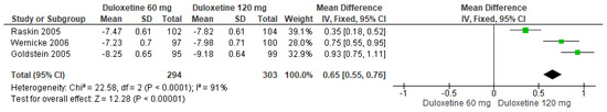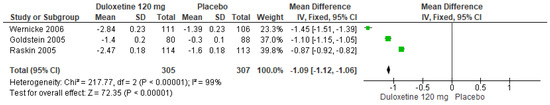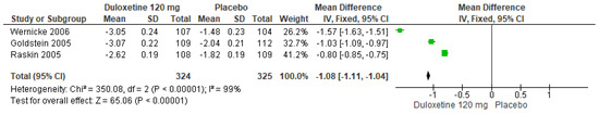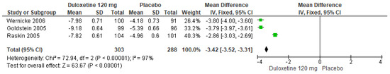 - Kajdasz, D.K.; Iyengar, S.; Desaiah, D.; Backonja, M.M.; Farrar, J.T.; Fishbain, D.A.; Jensen, T.S.; Rowbotham, M.C.; Sang, C.N.; Ziegler, D.; et al. Duloxetine for the management of diabetic peripheral neuropathic pain: Evidence-based findings from post hoc analysis of three multicenter, randomized, double-blind, placebo-controlled, parallel-group studies. Clin. Ther. 2007, 29 (Suppl. S1), 2536–2546. [Google Scholar] [CrossRef] [PubMed]