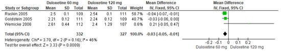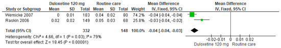 | Duloxetine: M = 88 (44.7) F = 109 (55.3) Routine care: M = 47 (49.0) F = 49 (51.0) | After a 13-week therapy with a placebo, patients were assigned as follows: Duloxetine Group: 120 mg/d after 3 days of 30 mg/d. Routine Care Group: Therapies that the investigator and patients considered optimal. 52 weeks of oral administration. |