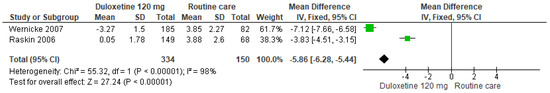 Chicago/Turabian StyleValenzuela-Fuenzalida, Juan José, Michelle López-Chaparro, Marisol Barahona-Vásquez, Javiera Campos-Valdes, Javiera Cordero Gonzalez, Pablo Nova-Baeza, Mathias Orellana-Donoso, Alejandra Suazo-Santibañez, Gustavo Oyanedel-Amaro, and Héctor Gutiérrez Espinoza. 2024. "Effectiveness of Duloxetine versus Other Therapeutic Modalities in Patients with Diabetic Neuropathic Pain: A Systematic Review and Meta-Analysis" Pharmaceuticals 17, no. 7: 856. https://doi.org/10.3390/ph17070856