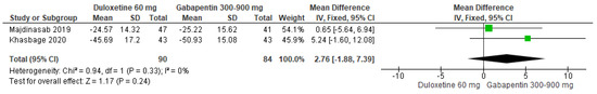 | Duloxetine: M = 27 (62.8) F = 16 (37.2) Gabapentin: M = 25 (58.1) F = 18 (41.9) | Duloxetine Group: 60 mg/d at bedtime. Gabapentin Group: 300 mg/d at bedtime. 12 weeks of administration. | |