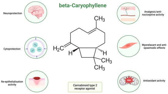 Β-caryophyllene—structure and biological activity (created with BioRender.com, assessed on 27 May 2024).