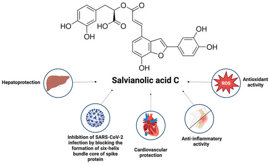 In 2020, it was reported that salvianolic acid C could inhibit SARS-CoV-2 infection by blocking the formation of the six-helix bundle of the core of the spike protein [103]. The compound is also associated with being a cardioprotector [101] and hepatoprotector [104] and as a compound with a potential for improving liver fibrosis [102] (Figure 3).