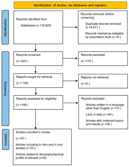 The following keywords were used in the search process: “Salvia verticillata”, “Salvia verticillata essential oil study”, “Salvia verticillata antioxidant activity”, “anticancer properties of Salvia verticillata”, “Salvia verticillata composition”, “Chemical composition of Salvia verticillata”, “Salvia verticillata and Alzheimer’s disease”, and “Salvia verticillata antibacterial activity”. In the final stage, relevant studies were selected based on the exclusion and inclusion criteria. The exclusion criteria were webinars or blogs, and articles containing a lack of data. The inclusion criteria were in vitro studies, animal studies, and studies investigating the impact of the chemical composition. A total of 57 studies on the biological activity of S.verticillata extracts and EOs were selected and included in the present review.