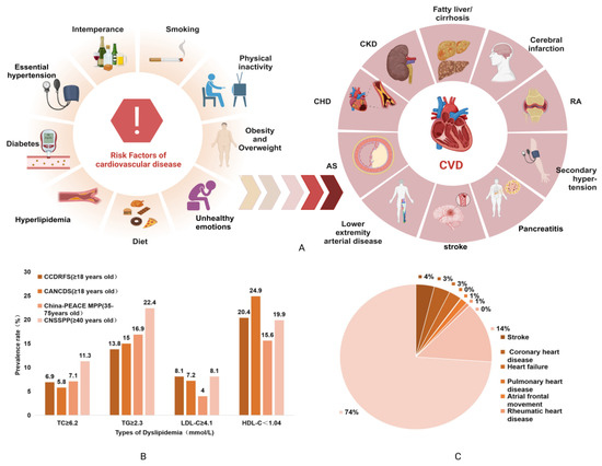 (A) Risk factors of CVD and its associated complications. (B) Comparison of the prevalence rates of different types of dyslipidemias based on the results of the fourth CCDRFS project in 2013–2014, the Chinese Adult American Cancer and Sexually Transmitted Disease Surveillance (CANCDS) project in 2015, the Chinese Prevalence Screening and Prevention Project (CNSSPP) in 2014, and the China-PEACE MPP project in 2014–2019 [6]. (C) The distribution of various CVD types in 330 million CVD cases in China [4].