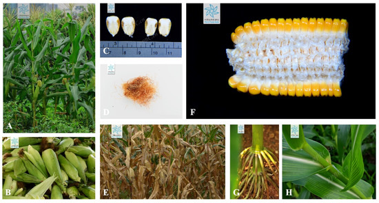 (A) Whole plant, (B) bracts, (C) brans, (D) silks, (E) stalks, (F) cobs, (G) roots, and (H) leaves of Zea mays L. [28].