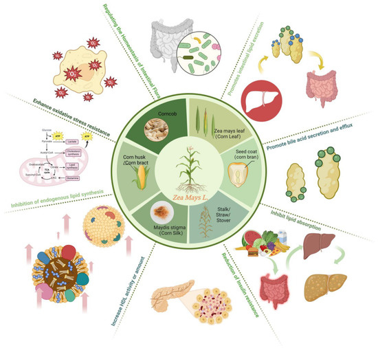 In recent years, studies have found that corn waste has various medicinal properties [7], e.g., corn bracts can reduce blood lipids [8]; corn silk has the effect of lowering blood lipids [9] and lowering blood pressure [10]; corn straw has antioxidant and hypoglycemic effects [11]; corn cob has the pharmacological effects of lowering blood sugar and regulating blood lipids [12]. One point that cannot be ignored is that the literature research has found that corn waste has significant effects on regulating blood lipids, with various mechanisms [13]. According to traditional Chinese medicine, the mechanisms of lowering blood lipids can be classified as (1) exerting or improving oxidative stress capacity [14], (2) modulating lipid metabolism by inhibiting the absorption and intestinal competition for exogenous lipids, inhibiting endogenous lipid synthesis [15], and promoting intestinal lipid excretion [16], (3) regulating bile acid metabolism by promoting the secretion and efflux of bile acids [17], (4) improving cholesterol metabolism by increasing HDL-C activity and quantity [18], and (5) modulating glucose metabolism to indirectly influence blood lipids by regulating insulin levels and reducing insulin resistance [19] and maintaining gut health by regulating intestinal flora homeostasis to regulate blood lipids [20]. The bioactive functions of corn waste in regulating blood lipids may be related to flavonoids [21], polyphenols [22], polysaccharides [12,23], dietary fiber, oils and fats [24], phytosterols [25,26], and anthocyanins [27]. Thus, by exploring the blood lipid-regulating effects and mechanisms of corn waste, this article contributes to the ongoing search for sustainable and effective approaches to manage dyslipidemia, a major global health concern.