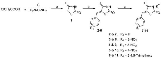 General Procedure for the Synthesis of the Potassium 5-Arylidenethiazolidin-2,4-dion-3-ides 7–11
