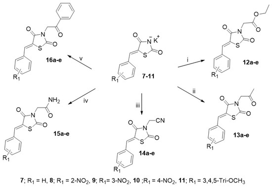 Compound 1 is a versatile heterocycle that allows the synthesis of various thiazolidinediones by virtue of its two reactive centers: (A) the acidic NH hydrogen at position 3 and (B) the active-methylene group at position 5. Thus, when this 5-methylene group was allowed to react, under Knoevenagel reaction conditions, with the aromatic aldehydes; benzaldehyde, o-, m-, p-nitrobenzaldehyde, and 3,4,5-trimethoxy benzaldehyde, the corresponding 5-stryryl-1,3-thiazolidine-2,4-diones 2–6 were obtained (Scheme 1) in 75–90% yields. These latter compounds 2–6, could be easily converted into the corresponding potassium salts 7–11 in 69–90% yields upon treatment with KOH in boiling ethanol or ethanol-dioxane mixture (Scheme 1). The reaction of the nucleophilic N-anion of the latter potassium salts 7–11 with a series of halo-compounds namely ethyl chloroacetate, chloroacetone, chloroacetonitrile, 2-chloroacetamide, and phenacyl bromide in refluxing DMF, resulted in the formation of a series of the corresponding target (Z)-N-substituted 5-styrylthiazolidinediones 12a-e to 16a-e (Scheme 2, Table 1) in 62–95% yields.