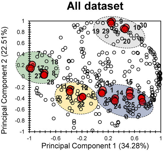 The grey cluster comprises molecules 9, 10, 19, 20, 29, and 30, showing a slight positive correlation along PC1 and a significant positive correlation along PC2. The blue cluster includes molecules 1, 2, 5, 6, 13, 14, 15, 16, 23, 24, 25, and 26, exhibiting a slight positive correlation along PC1 and a moderate negative correlation along PC2. The yellow cluster contains molecules 3, 4, 11, 12, 21, and 22, exhibiting a negative correlation along both PCs. Finally, the green cluster comprises molecules 7, 8, 17, 18, 27, and 28, demonstrating a pronounced negative correlation along PC1 and a slight positive correlation along PC2. These observations highlight the discrepancy among the four groups (clusters) of molecules regarding a wide range of electronic, chemical, and physical properties. This indicates that the individuals (molecules) gathered in each cluster are similar in terms of their chemical and physical properties, along with their biological activities.