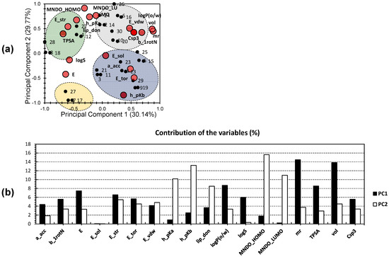 (a) PCA bi-plot of the 30 investigated molecules (individuals) following the 18 hand-picked variables (descriptors); the big red bullets present the variables, and the small black bullets present the individuals. (b) Contribution of the investigated factors toward the first two PCs.