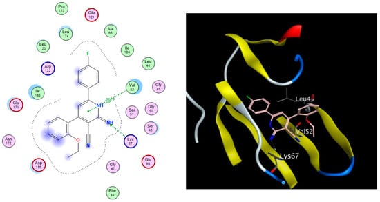 The sixteen selected compounds were subject to molecular docking to the PIM-1 Kinase enzyme (2OBJ). Similarly, these compounds were found to fit properly in the binding site of the target enzyme, with docking score values ranging from −13.03 to −8.28 kcal/mol (Table 7), with quite similar amino acid interactions patterns to compound 6, which indicates an appreciable PIM-1 kinase inhibitory potential as well. Compound 52 exhibited the best binding affinity to the enzyme, with a docking score of −13.03 kcal/mol compared to −12.08 kcal/mol for the co-crystallized ligand inhibitor, as shown in Figure 5.