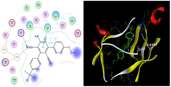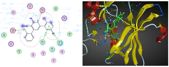 These nine proposed designs, derived from compound 6 and the co-crystallized ligand, were shown to fulfill the drug-likeness criteria according to Lipinski’s and Veber’s rules compared to the previous candidates listed in Table 2. Upon docking compounds 31–39 to the PIM-1 kinase enzyme (2OBJ), they were found to fit properly in the binding site, with docking score values ranging from −13.11 to −11.73 kcal/mol (Table 5). These compounds exhibited a similar amino acid interaction pattern to that of compound 6, indicating an appreciable PIM-1 kinase inhibitory potential. Compound 31 exhibited the best binding affinity to the target enzyme, with a docking score of −13.11 kcal/mol compared to the −12.08 kcal/mol obtained by the co-crystallized ligand inhibitor, as shown in Figure 4.