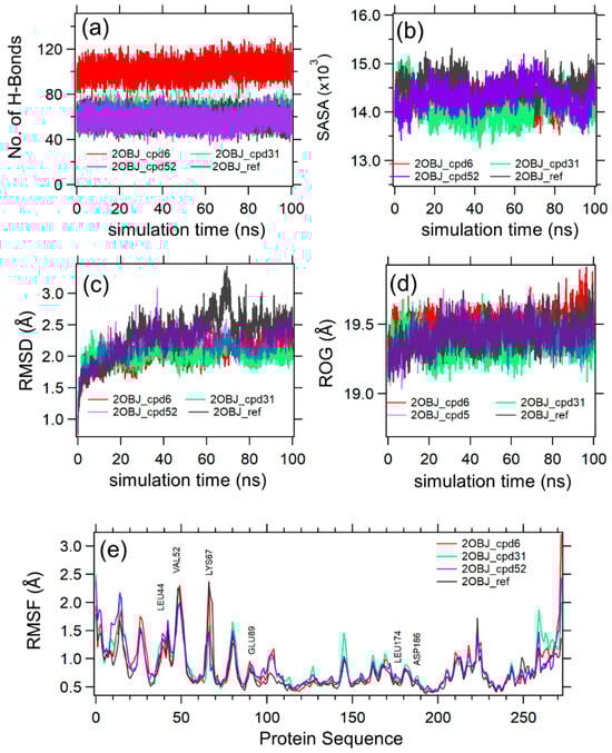 Molecular dynamics simulation data analysis for 2OBJ-cpd6, 2OBJ-cpd31, 2OBJ-cpd52, and 2OBJ-ref complexes. (a–d) show the H-bonds, SASA, RMSD, RoG and for the 2OBJ-cpd6 (red), 2OBJ-cpd31 (green), 2OBJ-cpd52 (purple), and 2OBJ-ref (black) complexes versus the simulation time in ns. (e) shows the per-residue RMSF from the protein sequence of 2OBJ-cpd6 (red), 2OBJ-cpd31 (green), 2OBJ-cpd52 (purple), and 2OBJ-ref (black) complexes.