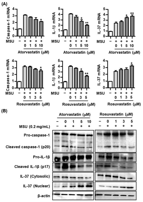 We evaluated the effects of HMG-CoA reductase inhibitors including atorvastatin and rosuvastatin on caspase-1, IL-1β, and IL-37 expression in THP-1 macrophages treated with 0.2 mg/mL of MSU crystals. Atorvastatin suppressed caspase-1 and IL-1β mRNA expression at doses of 5.0 and/or 10.0 μM but increased IL-37 mRNA expression in THP-1 macrophages treated with MSU at the same dosages (* p < 0.05 and ** p < 0.01, compared to cells without atorvastatin treatment) (Figure 2A). Similarly, rosuvastatin at a dose of 3.0 or 5.0 μM in uric-acid-induced inflammation inhibited caspase-1 and IL-1β mRNA expression, whereas IL-37 mRNA expression in THP-1 cells stimulated with MSU was increased by rosuvastatin at a dose of 5.0 μM (* p < 0.05 and ** p < 0.01, compared to cells without rosuvastatin treatment) (Figure 2A).