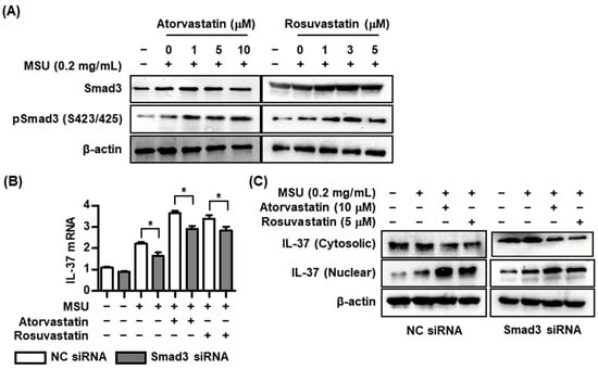 Mature IL-37 binds to phosphorylated Smad3 to lead to the generation of an IL-37/Smad3 complex in the cytoplasm that then moves into the nucleus [7,8,9,10]. Finally, IL-37 binding to Smad3 results in up- or down-regulation of diverse proinflammatory or anti-inflammatory gene expression [10]. Here, it was determined whether HMG-CoA reductase inhibitors regulated phosphorylation of Smad3 in the condition of MSU-crystal-induced stimulation in THP-1 macrophages. We found that atorvastatin and rosuvastatin significantly induced the phosphorylation of Smad3 in a dose-dependent manner (Figure 3A). This suggests that HMG-CoA reductase inhibitors augment the generation of the IL-37/Smad3 complex in uric-acid-induced inflammation. In the assessment of the effect of statins on Smad3-dependent IL-37 expression, IL-37 mRNA expression stimulated by atorvastatin and rosuvastatin in cells transfected with Smad3 siRNA was down-regulated, rather than in those with NC siRNA (Figure 3B). Cells transfected with Smad3 siRNA under stimulation with MSU alone showed lower IL-37 mRNA expression than did those with NC siRNA. In addition, stimulation with atorvastatin or rosuvastatin markedly decreased the translocation of IL-37 from the cytoplasm to the nucleus in THP-1 macrophages transfected with Smad3 siRNA under stimulation with MSU (Figure 3C).