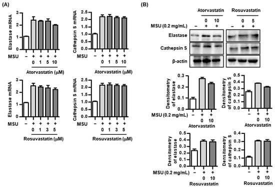 Changes in proteolytic enzymes by atorvastatin or rosuvastatin in THP-1 macrophages. (A,B) Expression of elastase and cathepsin S mRNA and protein by atorvastatin or rosuvastatin in THP-1 macrophages treated with MSU crystals. Values presented as mean ± SEM of three independent experiments. The representative images are illustrated after three independent experiments. Abbreviation: MSU, monosodium urate.