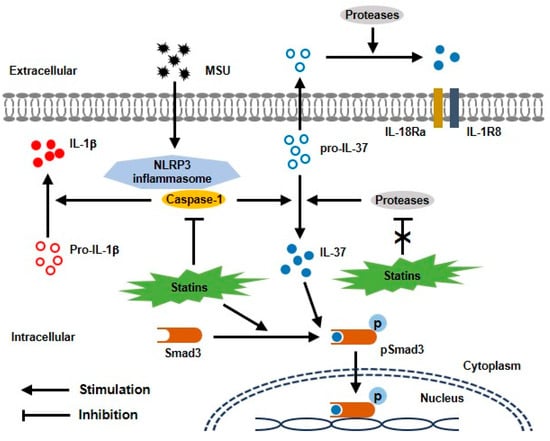 The regulation of proinflammatory cytokines has a crucial role in the inflammatory response to MSU crystals in the pathogenesis of gout [1,2]. Recent studies have implicated IL-1β as being generally considered a key proinflammatory cytokine, leading to the development of an acute gout attack. Several clinical studies have demonstrated that statin use could provide greater benefits regarding uric acid homeostasis, the risk of gout, and mortality in gout patients [25,26,27], although action mechanisms of statins for uric-acid-induced inflammatory responses have not been determined. Recently, HMG-CoA reductase inhibitors including atorvastatin, simvastatin, and mevastatin inhibited the activation of the MSU-induced NLRP3 inflammasome by the up-regulation of the peroxisome proliferator-activated receptor-γ (PPAR-γ), resulting in anti-inflammatory therapeutic action in gout [23]. THP-1 cells pre-treated with pitavastatin led to a reduction in MSU-stimulated IL-1β production and secretion through blocking caspase-1 activation [24]. To investigate the anti-inflammatory mechanism of statins in MSU-induced inflammation, we found that HMG-CoA reductase inhibitors including atorvastatin and rosuvastatin potently suppressed the release of IL-1β through up-regulation of the IL-37/Smad3 complex in THP-1 macrophages (Figure 5).