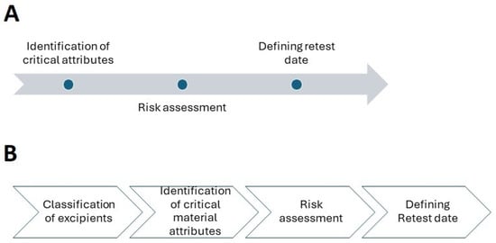 Proposed steps in establishing a retest date: (A) active pharmaceutical ingredients; (B) excipients.