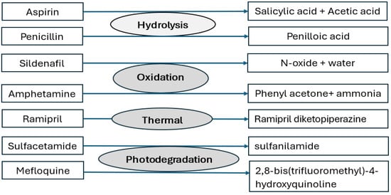 The term “pharmaceutical stability” refers to the ability of an API to withstand changes in quality attributes under specified environmental conditions, such as humidity and temperature [1]. API’s molecular structure and the environment affect how stable it is chemically. Drug substances may degrade due to thermal, hydrolytic, oxidative, or photochemical reactions [25] (Figure 2). Carboxylate ester, amide, and carbamate functional groups in API molecules render them more susceptible to hydrolysis. Similarly, APIs with carboxylic acid, carboxylate ester, hydroxyl group, unsaturated hydrocarbons, amide group, and amine group are prone to oxidation, whereas photolysis is common in carbonyl, nitro, alkene, and aromatic groups containing APIs [26]. Degradation can cause a decrease in the concentration of active substances as well as the generation of undesirable degradation products (impurities). Typically, drug degradation kinetics follow, zero, first, or second-order kinetics. The rate of these degradation reactions is described by a variety of parameters, including the rate constant, activation energy, half-life, and so on. The degradation kinetics of API are also influenced by the pH of the microenvironment, temperature, and the intensity of light exposure [1]. Stress and real-time stability studies are performed to obtain information about degradation products and the mechanism of their formation [27,28,29]. ICH defines stress testing as “Studies undertaken to elucidate the intrinsic stability of the drug substance [1]. Such testing is part of the development strategy and is normally carried out under more severe conditions than those used for accelerated testing”. In these studies, the incremental effects of temperature (e.g., 50 °C, 60 °C, etc.) and humidity (e.g., ≥75% RH), oxidation, and photolysis are carried out on drug substances. The impact of pH on drug substance hydrolysis is also evaluated. Stress-induced degradation products aid in the establishment of degradation pathways [30].Moreover, these studies also help in developing and validating stability-indicating characteristics of the analytical method. These studies are also useful in estimating the intrinsic stability of drug molecules. The degradation kinetics of an API help in the selection of appropriate storage conditions, the selection of container-closure systems, the selection of an optimal formulation development strategy, the anticipation of drug–excipient interactions, and the prediction of shelf life.