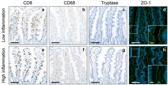 Representative images of the high and low intestinal inflammation groups. Representative images of cytotoxic T cells (CD8), macrophages (CD68) and mast cells (Tryptase) in the jejunum of individuals corresponding to the low inflammation group (a–d) and individuals corresponding to the high inflammation group (e–h). (d,h) Representative images of Zonula occludens-1 (ZO-1) in the jejunum of individuals with high (d) and low intestinal inflammation (h). The white boxes indicate regions of interest placed in the lower corner of (d,h). Black/white scale bar = 100 µm, yellow scale bar = 40 µm).