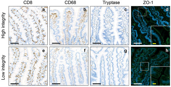 Representative images of the high and low intestinal integrity groups. Representative images of cytotoxic T cells (CD8), macrophages (CD68) and mast cells (Tryptase) in the jejunum of individuals corresponding to the low integrity group (a–d) and individuals corresponding to the high integrity group (e–h). (d,h) Representative images of Zonula occludens-1 (ZO-1) in the jejunum of individuals with a high (d) and low intestinal integrity (h). The white boxes indicate regions of interest placed in the lower corner of (d,h). Black/white scale bar = 100 µm, yellow scale bar = 40 µm).