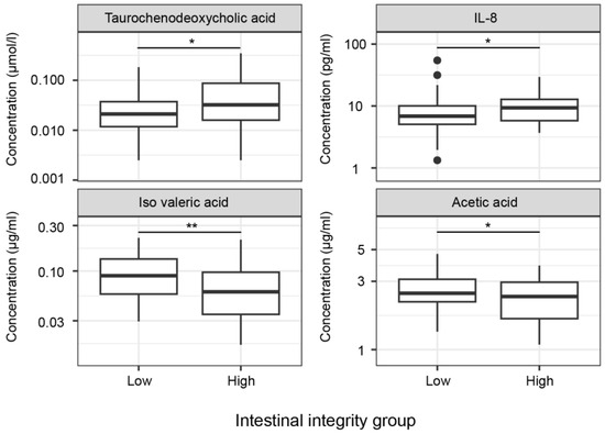 Significant differences in metabolites and cytokines between the low and high intestinal integrity groups. Levels of tauro-chenodeoxycholic acid (p = 0.019) and IL-8 (p = 0.011) were significantly higher, while levels of iso valeric acid (p = 0.003) and acetic acid (p = 0.043) were significantly lower in the high intestinal integrity group. Abbreviations: IL, interleukin, * = p < 0.05, ** = p < 0.01.