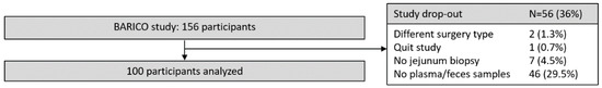 Flowchart with included participants. Out of the 156 participants enrolled in the BARICO study, 2 participants were excluded due to a last-minute change of surgery (sleeve gastrectomy); 1 other participant dropped out of the study before the surgery; from 7 participants, no jejunum biopsy was collected; and from 46 participants, no plasma and/or fecal samples were available, leaving 100 participants eligible for analysis.