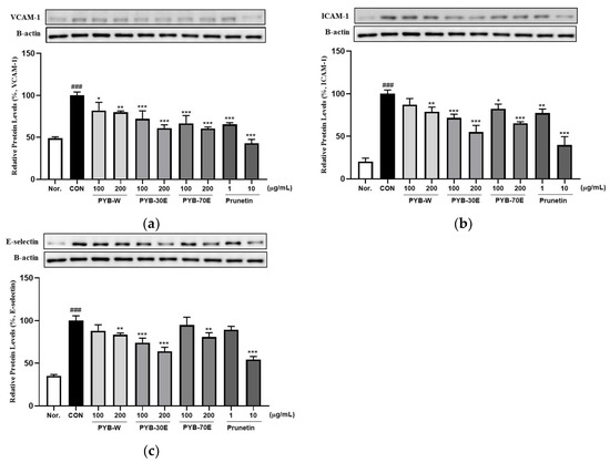 To confirm the intracellular expression of vascular cell adhesion molecule-1 (VCAM-1), intercellular adhesion molecule-1 (ICAM-1), and E-selectin, 1 × 105 cells were placed in a 12 well plate coated with 0.1% gelatin. The cells were cultured for more than 24 h until the cells were confluent. After treatment with 200 ng/mL of TNF-α and PYB at different concentrations, the cells were cultured for 6 h. Cultured cells were washed with PBS, harvested by adding RIPA buffer, and centrifuged. The supernatant was collected, and the protein concentration was quantified using a BSA kit. Proteins were separated by electrophoresis on a 10% sodium dodecyl sulfate (SDS)-polyacrylamide gel. The separated proteins were transferred to a polyvinylidene fluoride (PVDF) membrane at 100 V for 1 h, blocked in 5% skim milk, and washed three times for 15 min with Tris-buffered saline containing 5% Tween-20 (TBS-T). The reaction was performed with a primary antibody diluted 1:200–1:1000 and then washed with TBS-T. Next, horseradish peroxidase (HRP)-conjugated anti-rabbit IgG and anti-mouse IgG were diluted to 1:3000 and allowed to react for 1 h. The membranes were then washed with TBS-T. The level of protein expression was confirmed using the ChemiDoc™ imaging system (Bio-Rad, Hercules, CA, USA). The membranes were incubated using an ECL kit for light emission, and then imaged using an imaging densitometer (ImageJ bundled with 64-bit Java 1.8.0_112). The expression levels were quantified.