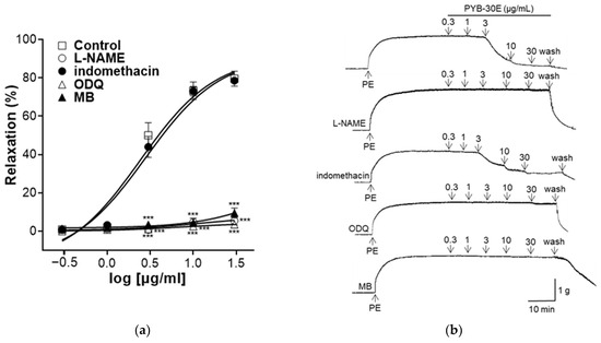 The relaxant effect of PYB-30E on PE (1 μM)-induced endothelial-intact aortic rings contraction in the presence or absence (Control) of L-NAME (100 μM), indomethacin (10 μM), ODQ (10 μM), and MB (10 μM). (a) Representative trace under the indicated conditions. (b) Data points represent mean ± SEM (n = 4–5). *** p < 0.001 vs. control. PE, Phenylephrine; L-NAME, NO synthase inhibitor; ODQ, 1-H-[1,2,4]-oxadiazolo[4,3-α]quinoxalin-1-one; MB, methylene blue. *** p < 0.001 vs. control.