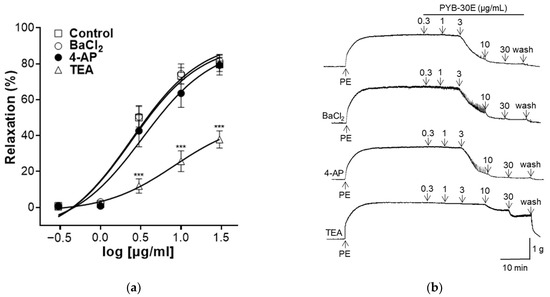 To investigate the effect of PYB-30E on K+ channel-induced vascular relaxation, aortic rings were treated with barium chloride (BaCl2, inwardly rectifying K+ channel blocker, 10 μM), 4-aminopyridine (4-AP, voltage-dependent K+ channel blocker, 1 mM), or tetraethylammonium chloride (TEA, non-selective calcium-activated K+ channel blocker, 1 mM) for 20 min. Afterwards, the aortic rings were contracted with PE (1 μM) and then treated with PYB-30E at different concentrations (0.3, 1, 3, 10, 30 μg/mL) to compare the vascular relaxation effect with the control group that was not treated with the blockers.