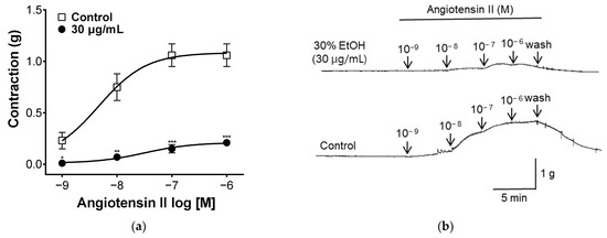 Angiotensin II is a hormone that affects vasoconstriction by binding to the Angiotensin II receptor type 1(AT1) receptor in vascular smooth muscle and increasing intracellular calcium concentrations [38]. To evaluate the angiotensin II-related mechanisms, blood vessel sections were treated with different concentrations of angiotensin II. As shown in Figure 7, when treated with angiotensin II, vascular segments contracted. Vascular constriction was suppressed in the group pretreated with PYB-30E. This suggests that PYB-30E may be taken to improve blood circulation disorders by inhibiting the action of angiotensin II.