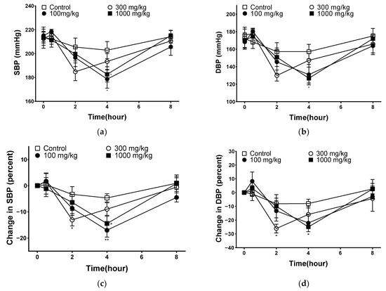 Hypertension increases peripheral vascular resistance, which leads to a decrease in vascular elasticity and luminal diameter of the vasculature [39]. The goal of hypertension treatment is to maintain blood pressure at an appropriate level, and the measurement of systolic and diastolic blood pressures plays an important role in hypertension [40]. The blood pressure-lowering effect of PYB-30E was measured to evaluate improvements in blood circulation. As shown in Figure 8, systolic blood pressure (SBP) and diastolic blood pressure (DBP) were measured at 0 h before oral administration (baseline blood pressure), and 30 min, 2 h, 4 h, 8 h after the oral administration of PYB-30E to SHR. After 4 h, SBP decreased significantly in the 100 and 1000 mg/kg groups, and DBP decreased in the 1000 mg/kg group. The degree of change in blood pressure for each SHR due to differences in blood pressure between individual SHRs was calculated and compared with that of the control group. At 2 h after administration, the 300 mg/kg group showed a significant decrease in SBP and DBP. After 4 h of administration, SBP significantly decreased in the 100 and 1000 mg/kg groups, whereas DBP decreased in the 1000 mg/kg group. This suggests that PYB-30E lowers blood pressure and improves blood circulation by increasing blood vessel elasticity.