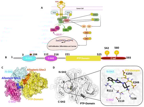 (A) The Ras/Raf pathway induces cell survival and proliferation due to the downstream signaling of SHP2. (B) A schematic representation of the SHP2 protein’s domains. The widely occurring mutation is highlighted with a red circle; among them, the E76K /D mutation was significantly observed in colorectal and breast cancer. (C) In the surface model of SHP2, the promising allosteric sites responsible for SHP2 inhibition are highlighted in blue and orange. (D) The key residues responsible for interacting with the known allosteric inhibitor SHP099 are shown in the stick model.