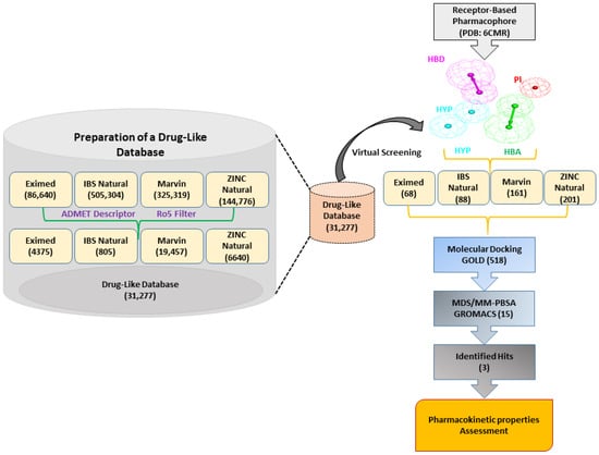 Four chemical databases (Eximed, ZINC natural, Marvin supernatural, and InterBioScreen) were selected to identify potential SHP2 allosteric inhibitors. To identify compounds with drug-like properties from the chemical databases containing thousands of compounds, we initially applied the ADMET descriptors and the drug-likeness rule known as Lipinski’s Rule of Five (Ro5), available in Discovery Studio (DS). This screening aimed to select compounds with acceptable pharmacokinetic characteristics [22,37,38]. In the next step, the selected validated PM was subjected as an input query to screen out the prepared drug-like database using Ligand Pharmacophore Mapping with the Best mapping option of DS [36].