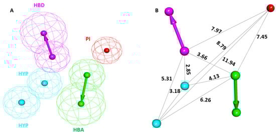 The chemical characterization and interfeature distance of the selected pharmacophore model. (A) Magenta, cyan, green, and red colors represent hydrogen bond donor (HBD), hydrophobic (HYP), hydrogen bond acceptor (HBA), and positive ionizable (PI) features, respectively. (B) The interfeature distance of the selected model is displayed in Å.