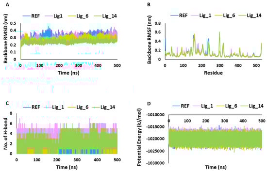 To evaluate simulation systems’ stability, the protein’s dynamics upon ligand binding were quantitatively assessed using root-mean-square deviation (RMSD), root-mean-square fluctuations (RMSFs), and potential energy calculations. The calculations were carried out utilizing the “gmx rmsd”, “gmx rmsf”, and “gmx energy” commands in GROMACS.