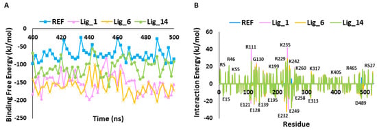 (A) Calculation of binding free energy for REF and identified hit molecules Lig_1, Lig_6, and Lig_14, calculated using MM-PBSA method. (B) Per residue energy decomposition of REF and hits.