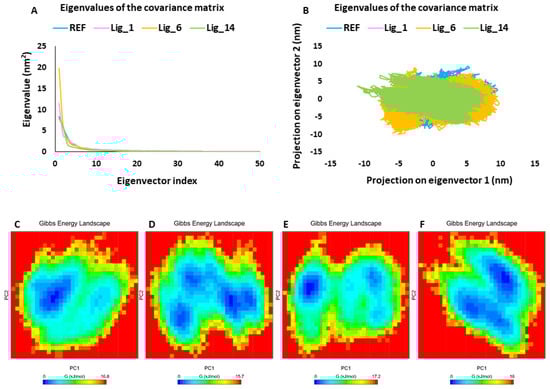 PCA. (A) The eigenvector index, (B) PC1 and PC2, and (C–F) free energy landscape of REF, Lig_1, Lig_6, and Lig_14, respectively. Blue spots in the plots indicate the energy minima, whereas the red color represents a higher energy conformation.