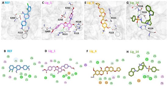 The binding modes of (A) REF, (C) LIG_1, (E) Lig_6, and (G) Lig_14 with the allosteric site residues of SHP2. REF, Lig_1, Lig_6, and Lig_14 are shown in blue, pink, yellow, and green, respectively, represented in the stick model. The lower panel represents the 2D molecular interaction of (B) REF, (D) Lig_1, (F) Lig_6, and (H) Lig_14 with active site residues. The hydrogen bonds are shown in green dashed lines, while π-π, π-alkyl, π-cation π-sulfur, and π-σ interactions are shown as pink, orange, yellow, and purple dashed lines, respectively.