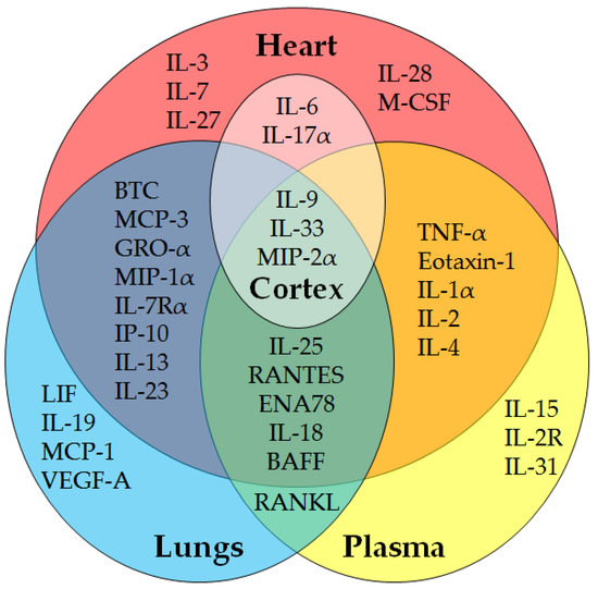 A summary Venn diagram (Figure 1) of protein changes across organs demonstrates a wide range of impacts from fentanyl overdose with many cardiopulmonary effects. Figure 1 displays analytes that were significantly different (p < 0.05, increased or decreased) from control, regardless of dose or time point. The cortex revealed five analytes with significance; three were shared with the heart, lungs, and plasma (IL-9, IL-33, and MIP-2α) and two were shared with the heart exclusively (IL-6, IL-17A). In contrast, plasma presented three unique proteins (IL-2R, IL-15, and IL-33) out of 17 total, lungs had four unique analytes (LIF, IL-19, MCP-1, and VEGF-A) out of 21 total, and the heart had the most, with five unique analytes (IL-3, IL-7, IL-27, IL-28, and M-CSF) out of 28 total. Heart, lungs, and plasma all presented significant changes in IL-25, RANTES, ENA78, IL-18, or BAFF. While the plasma and lungs only had one common analyte, RANKL, the plasma and heart shared five proteins (eotaxin-1, IL-1α, IL-2, IL-4, and TNF-α), and the heart and lungs shared eight (IL-13, IL-23, IP-10, IL-7Rα, GRO-α, BTC, MIP-1α, and MCP-3).