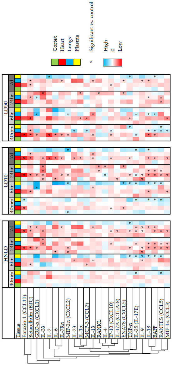 Stratifying the data by dose and time, Figure 2 shows a heatmap summary of normalized log2-transformed concentration values across all organs and plasma for analytes shared with significance in at least two organs or plasma, derived from concentration data in Figure S1. Broadly, HNLD and LD10 doses appear to elicit similar responses, distinct from the LD50 dose: at early time points (40 min, 6 hr), HNLD and LD10 caused few significant changes across all samples (8.9 ± 2.3% of all analytes), in comparison to widespread significant decreases in heart and lung tissue at later time points (24 hr, 7 d; 22.7 ± 1.9% of all analytes). In contrast, LD50-treated subjects had a greater response earlier when compared to later time points (17.2 ± 5.8% vs. 6.3 ± 3.1% of all analytes). Unsupervised hierarchical clustering reveal a segregation of cardiac-specific responses (e.g., eotaxin-1, betacellulin (BTC), and GRO-α) from significant analytes found across the heart, lungs, and plasma (e.g., RANTES, BAFF, and IL-18).