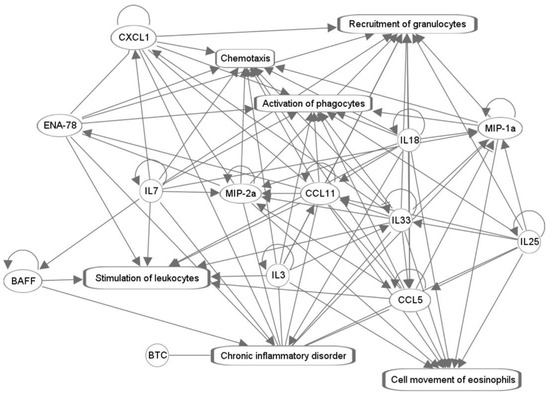 The analytes with the greatest contributions to PC1 and PC2 loading values were used to generate the network of biofunctions presented in Figure 3. Due to a low sample number (n = 3–4 per tissue x time point x dose group), the pathway was generated regardless of directionality (i.e., activation or inhibition based on the increase or decrease in protein concentration). The central functions linked to these cytokines, chemokines, and growth factors, ranked by number of nodes, include chronic inflammatory disorder (13 nodes: BTC, ENA78, BAFF, IL-7, CXCL1, MIP-2α, IL-3, CCL11 (eotaxin-1), IL-18, IL-33, CCL5) RANTES), IL-25, MIP-1α), activation of phagocytes (10 nodes: MIP-1α, IL-25, CCL5, IL-33, IL-18, CCL11 (eotaxin-1), IL-3, IL-7, CXCL1, ENA78), granulocyte recruitment (9 nodes: GRO-α (CXCL1), ENA78, IL-7, MIP-2α, eotaxin-1 (CCL11), IL-18, IL-25, IL-33, MIP-1α), chemotaxis (9 nodes: ENA78, GRO-α (CXCL1), IL-7, MIP-2α, IL-3, CCL11, IL-33, MIP-1α, IL-18), eosinophil movement (8 nodes: eotaxin-1 (CCL11), IL-3, IL-18, IL-25, IL-33, MIP-1α, and MIP-2α, and RANTES (CCL5)), and stimulation of leukocytes (8 nodes: BAFF, ENA78, IL-7, CCL11. IL-18, IL-33, IL-3, and CCL5).