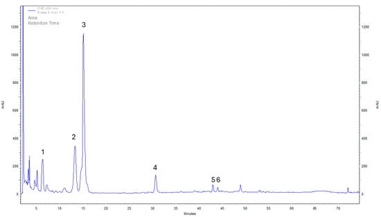 Example chromatogram of neochlorogenic acid (1), chlorogenic acid (2), caffeine (3), 4-feruloylquinic acid (4), isochlorogenic acid (5), and 3,5-di-caffeoylquinic acid (6) in the brewed coffee with Cordyceps militaris.