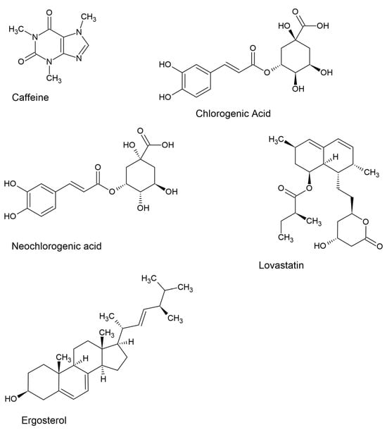 Structural formulas of bioactive substances characteristic of coffee (caffeine, chlorogenic acid, neochlorogenic acid) and mushroom material (lovastatin, ergosterol).